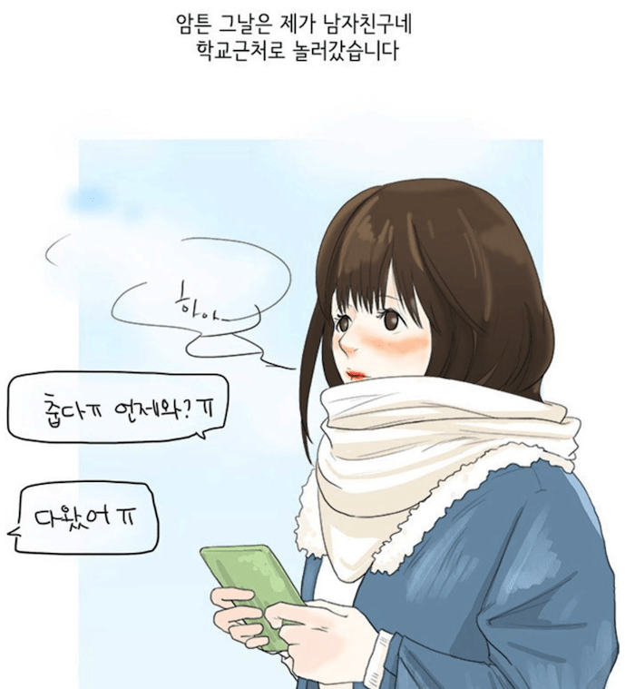 네임드 썰만화 (야누 / 은설 / 폭시) - 첫 번째 썰은 대학생 커플의 이야기 !! 장거리 연애라서 서로의 학교 근처로 가끔 놀러가는 커풀인데 이번에는 여자친구가 남자친구네 학교로 놀러 왔습니다. 20대 대학생 때에는 어떤 연애를 해보셨나요? 여기 커플의 이야기 궁금하시다면? 웹툰gogo??