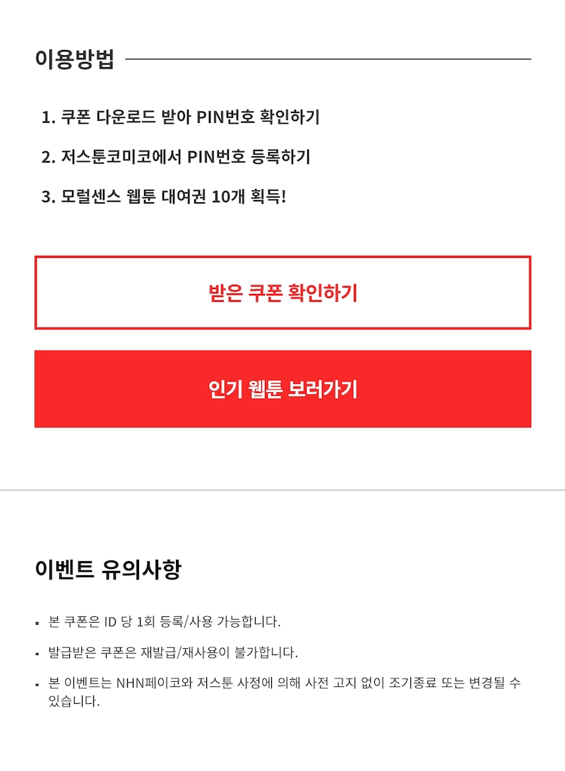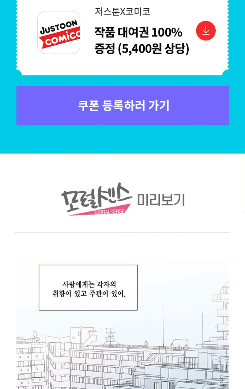 받는 방법은 페이코 >> 쿠폰 >> 모럴센스 찾아서 >> 쿠폰받기 >> 저스툰이나 코미코에서 입력하기