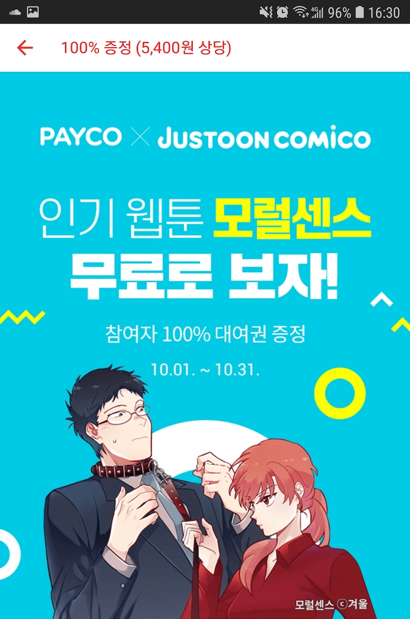 페이코에서 이벤트 진행하네요. 저스툰, 코미코에서 보실 수 있는 모럴센스 웹툰 보실 수 있는 대여권을 주고 있습니다.